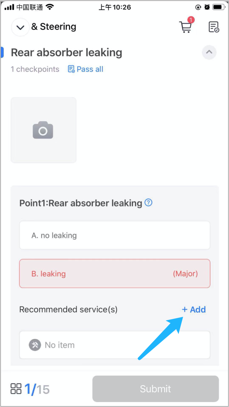 When checking the "Rear absorber leaking", the technician finds that the rear absorber was leaking, so he wants to add a recommended service to the vehicle. He clicks "Add", a window pops up for adding service items.