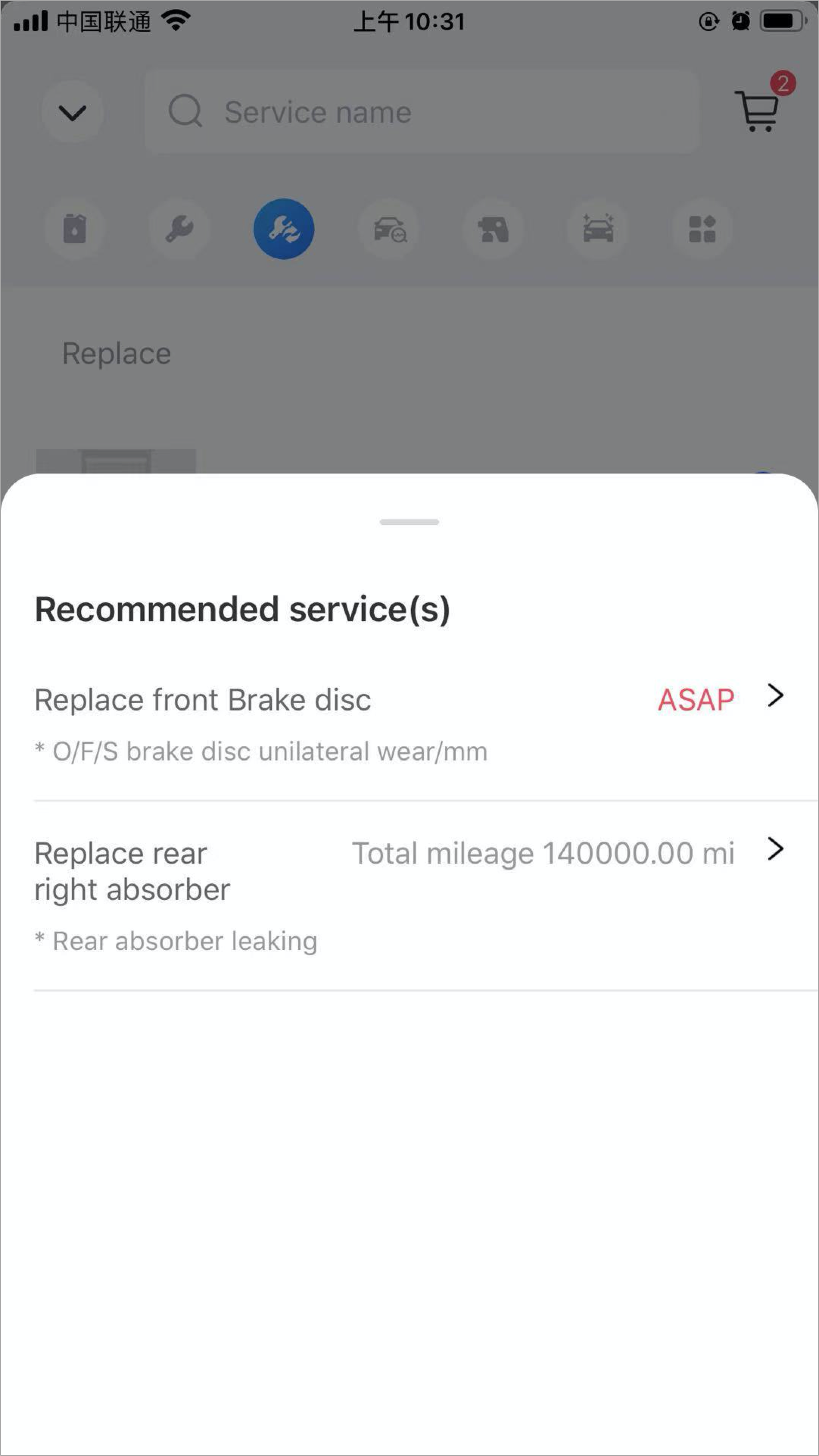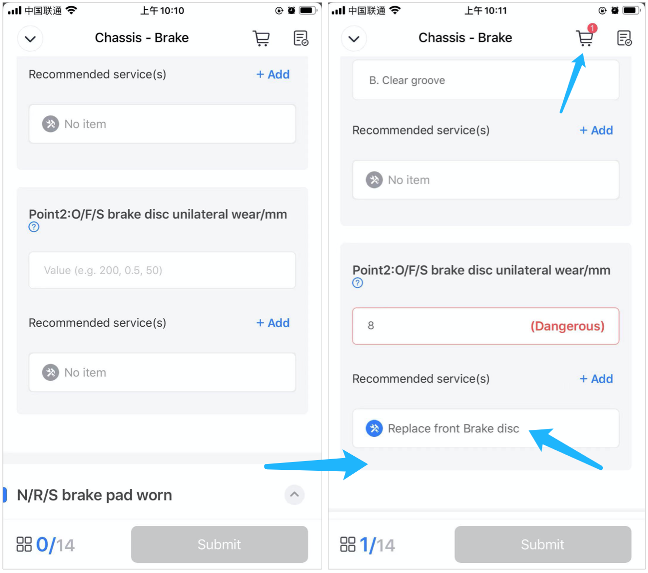 When checking the chassis system, the technician finds that the O/F/S brake disc unilateral wear is dangerous. After inputting the number, the recommended item( "replace front brake disc") pops up and is automatically added to the shopping cart in the upper right corner.