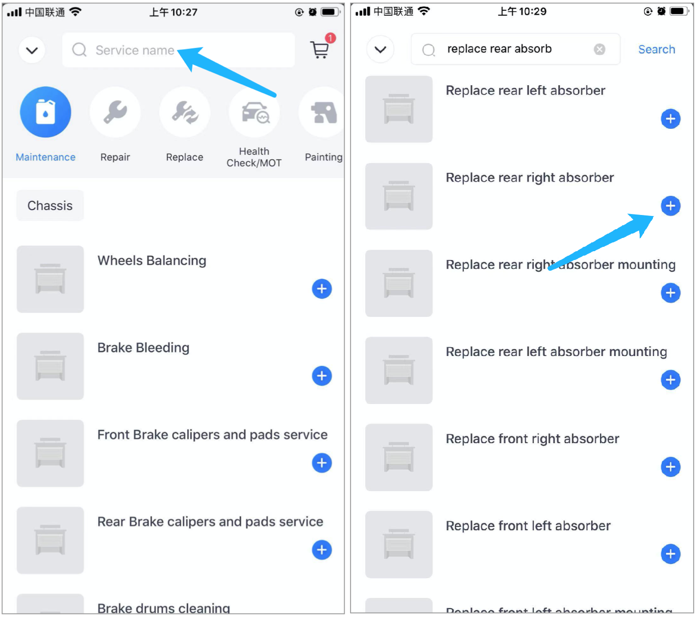 The technician searches "Replace rear absorber", then clicks "+" to add it.