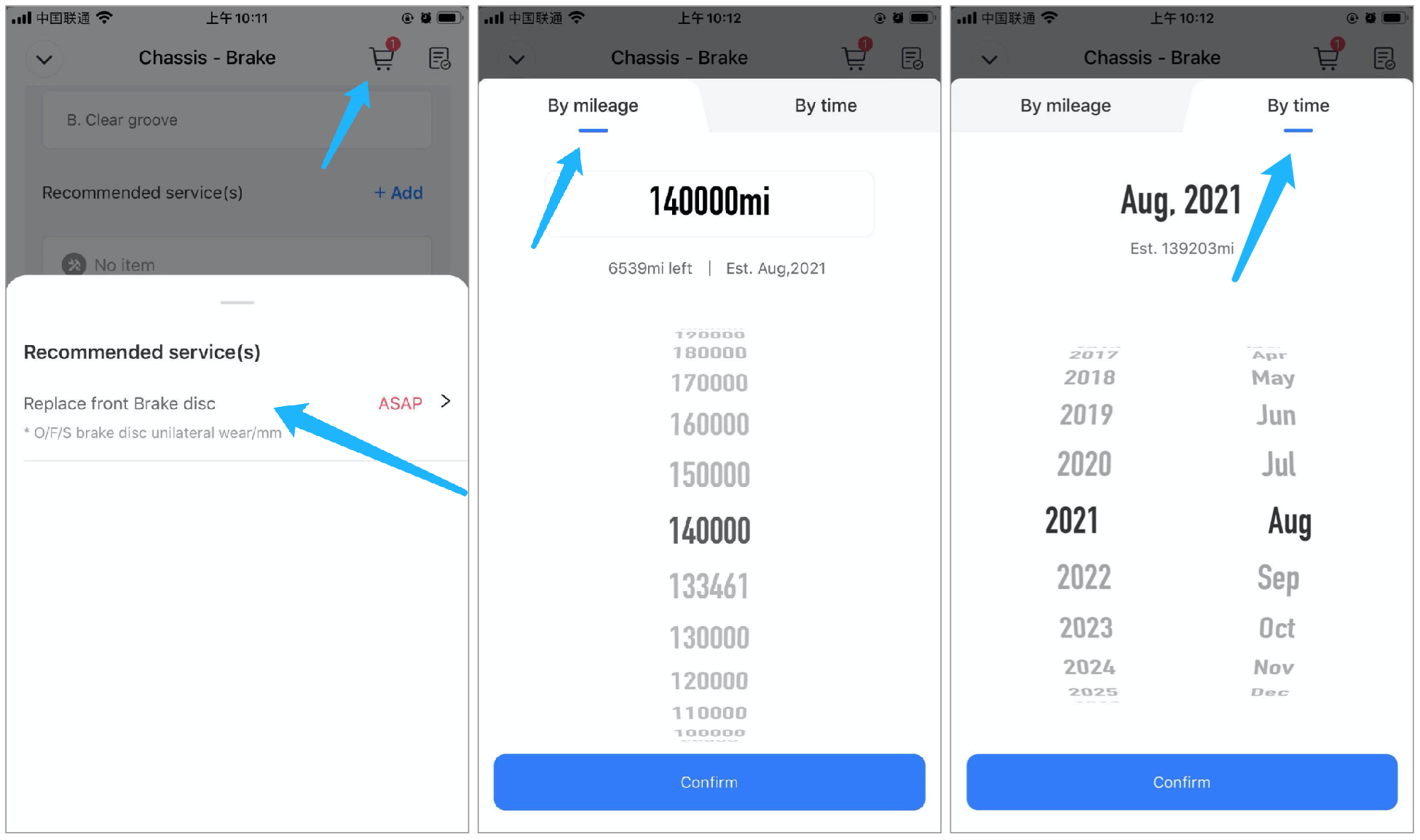 The technician clicks on the "Shopping cart", and a window pops up with a list of recommended services. The technician clicks on the "replace front brake disc" to modify the total mileage/date of maintenance Period expiration.