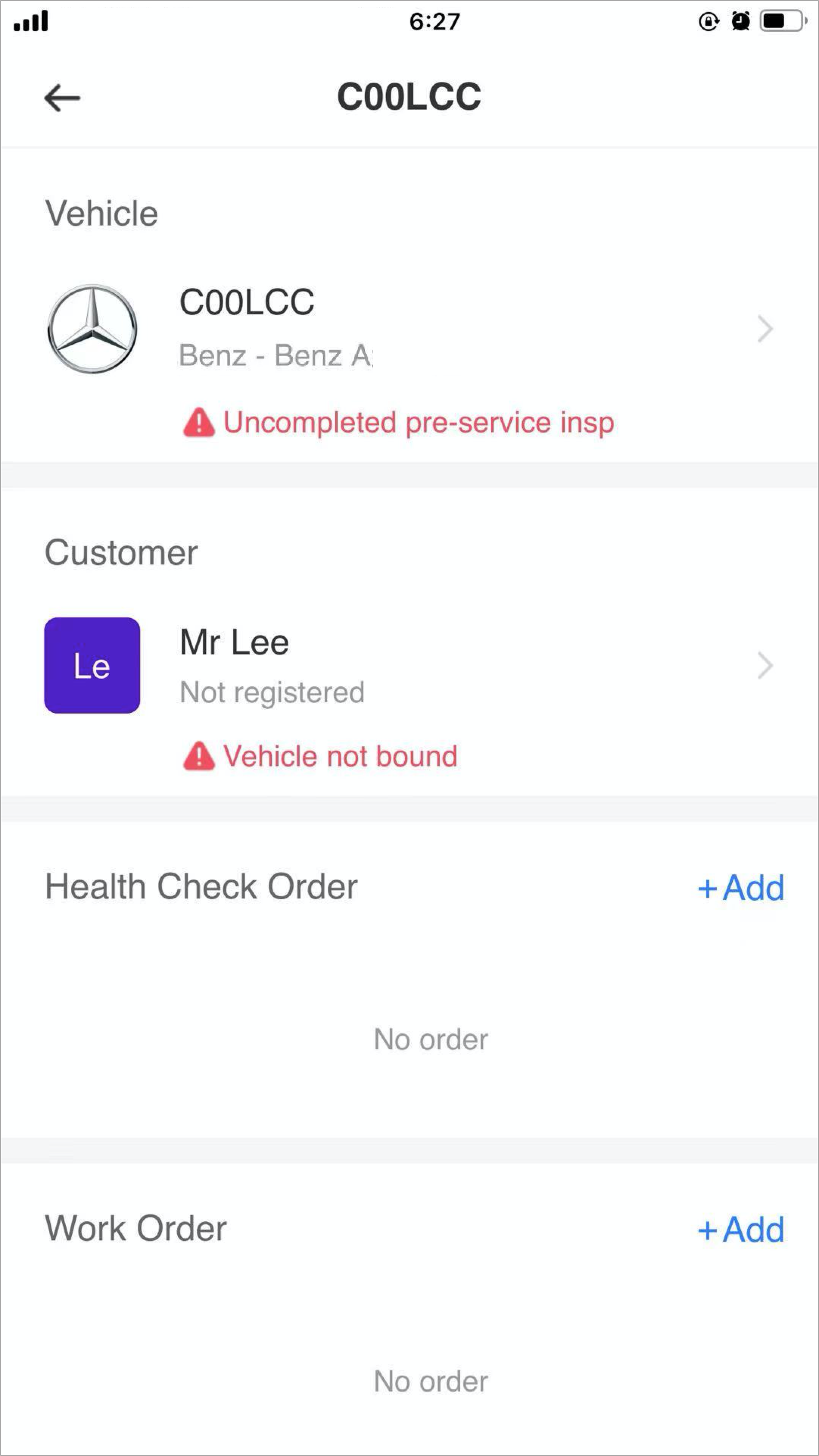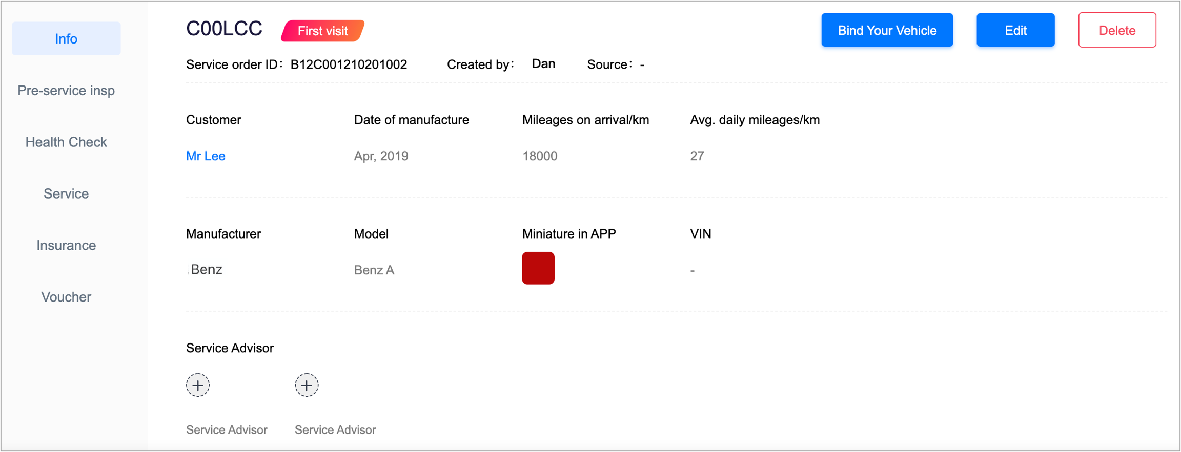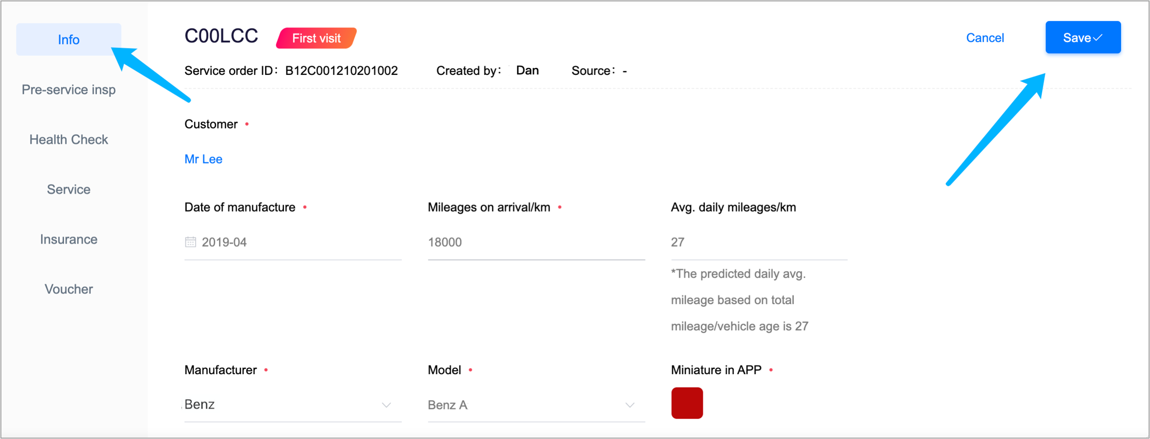 To create a Service Order for the vehicle's first visit, you need to input the complete information. From the second visit, all you need to input is the license plate. The complete information will be displayed automatically, and you don't need to input it again.