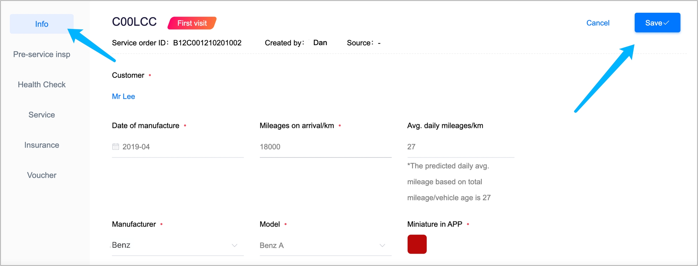 Mercedes-Benz A arrives at the workshop for the first time, and the staff uses Shop OS to create a Service Order for the vehicle.