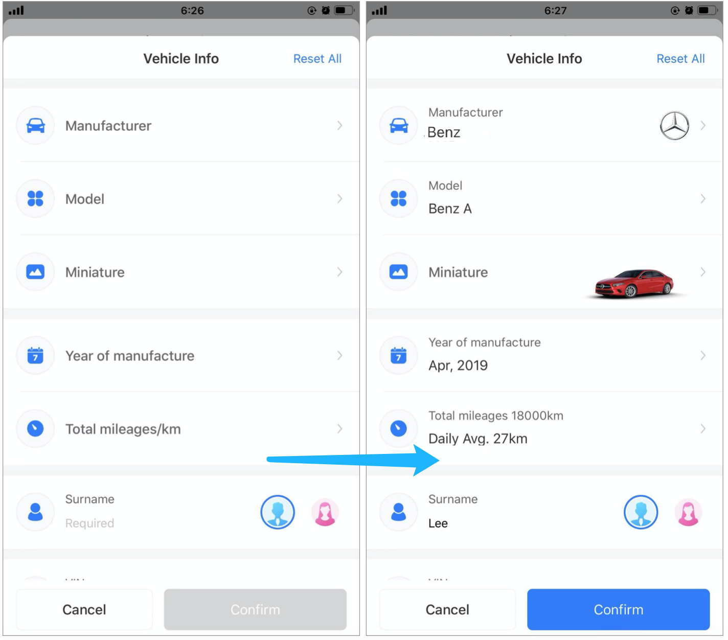 The technician inputs manufacturer, model, year of manufacture, total mileage/km, and the car owner's surname, then clicks "Confirm", a window will pop up for confirming the Pre-inspection.