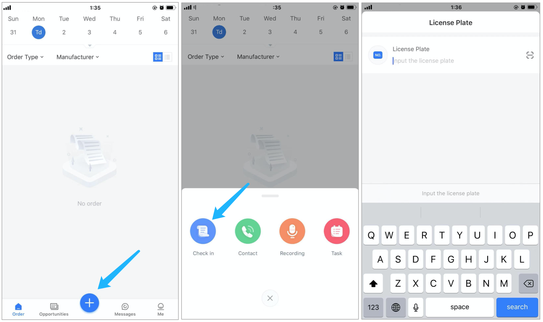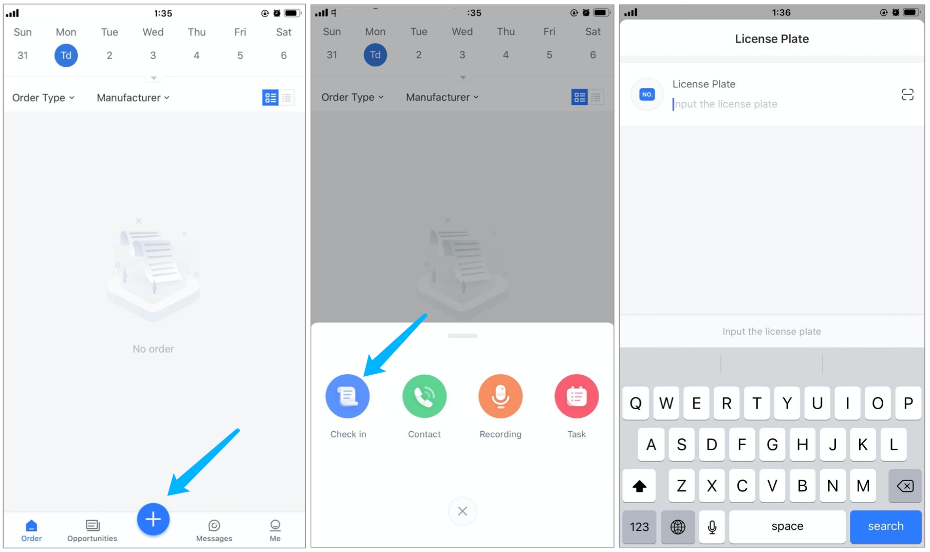 The technician logs in Intelligent Technician App, clicks "+", then clicks "Check in", a window will pop up for inputting vehicle's information.