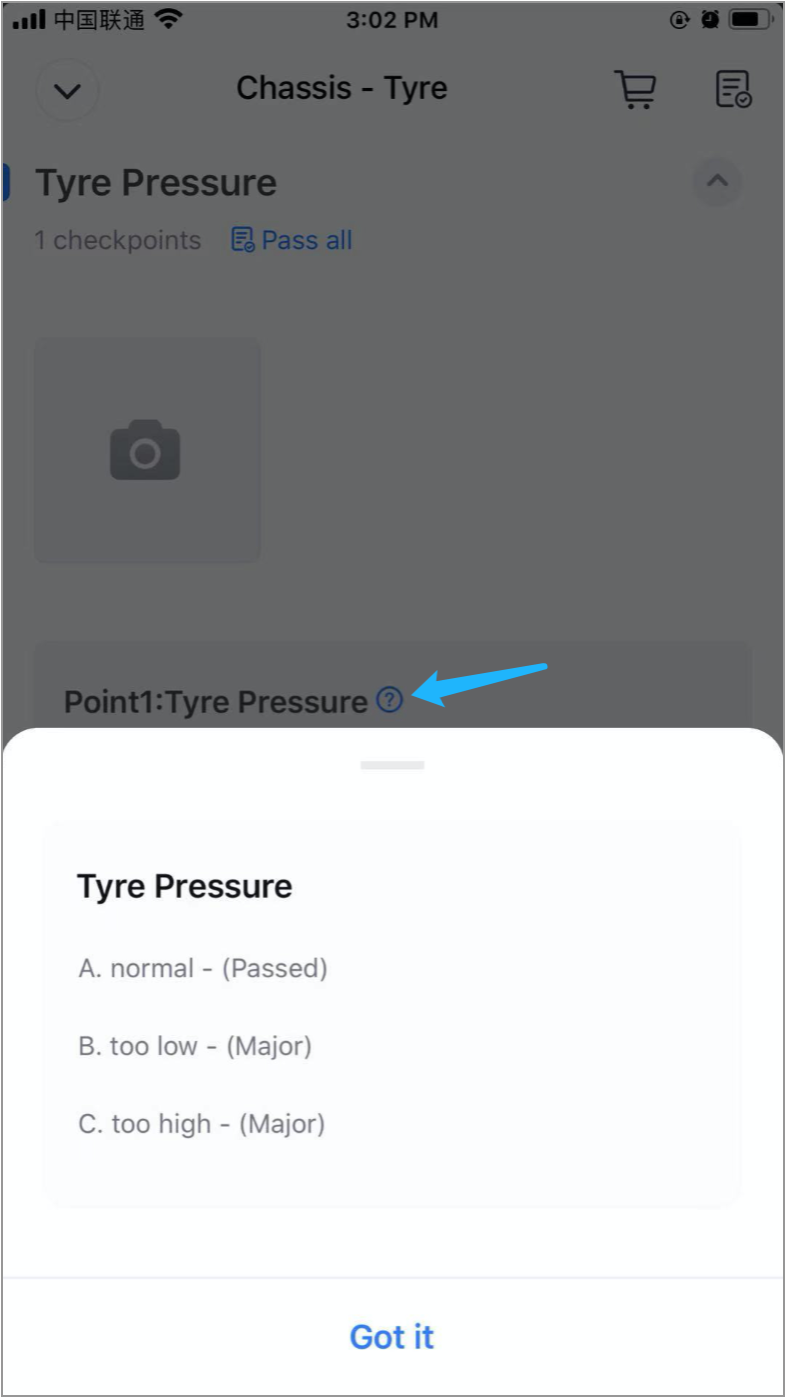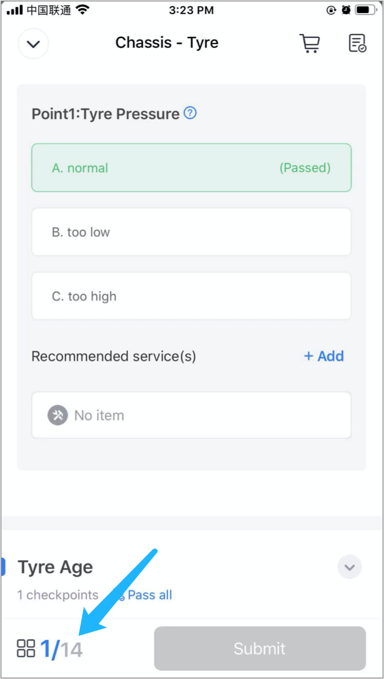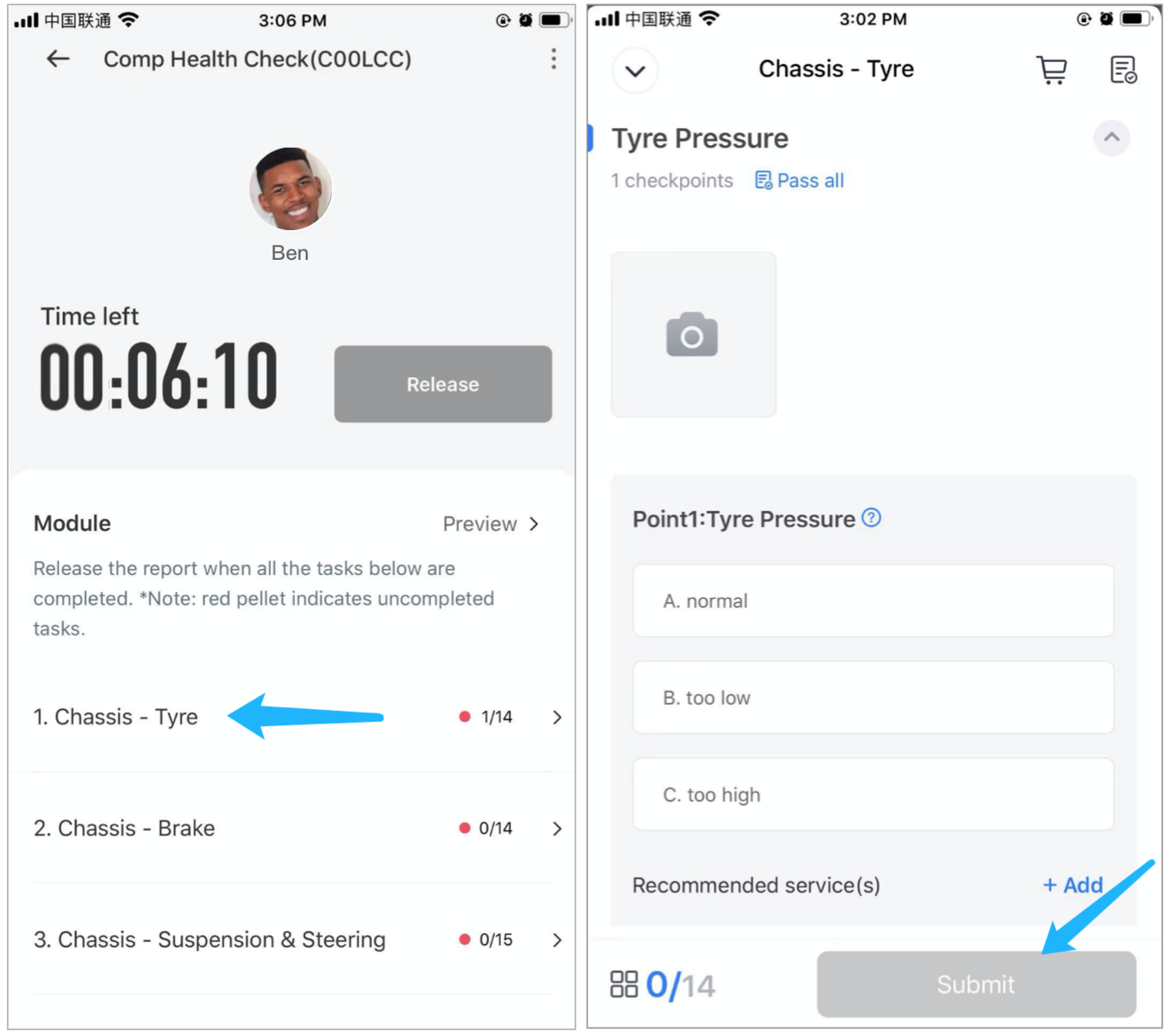 The technician performs the inspection in the order of prompts on the module page. Clicks "Chassis - Tyre", takes photos and answers the questions according to the test results, and clicks "Submit" after completion.