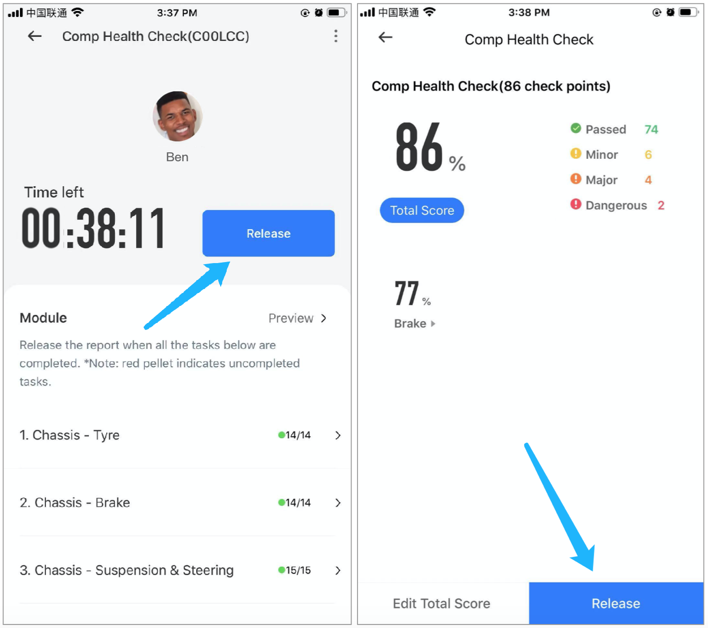 After the technician completes all module, clicks "Release", then clicks "Release" after confirming the score.