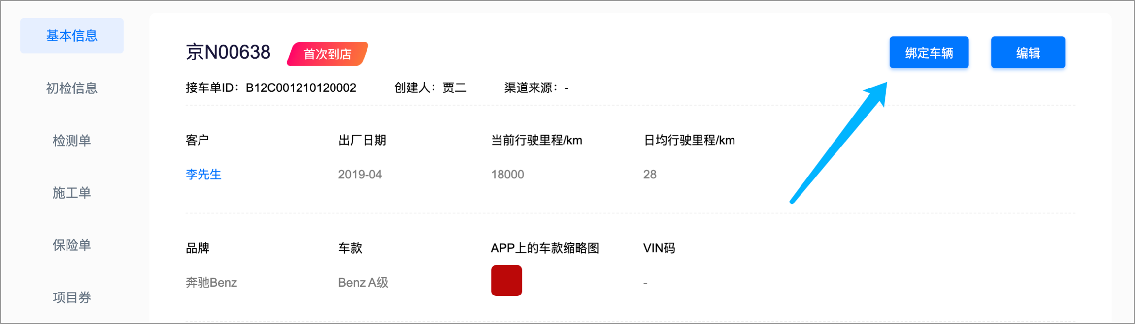 门店工作人员为奔驰A创建接车单完成,技师使用Shop OS(门店管理系统)帮车主绑定车辆。