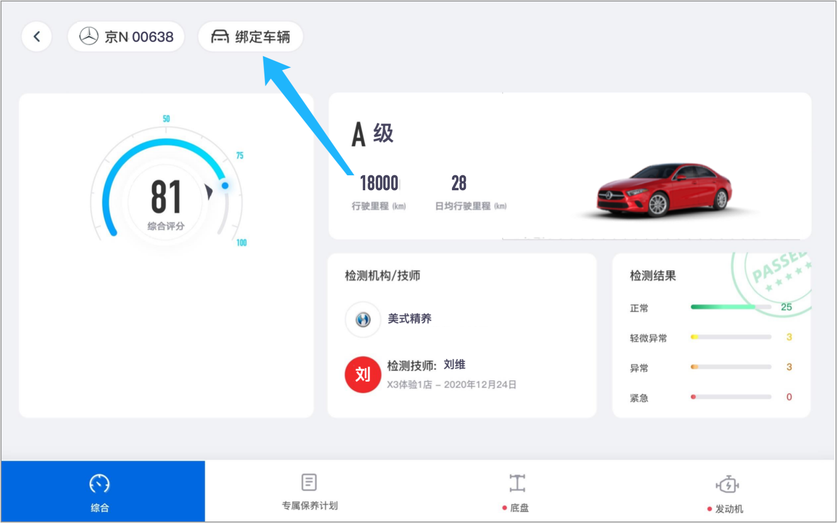 绑定车辆是把Intelligent Motorist(车主端)和车辆信息绑定的操作。在完成服务过程中,门店技师或工作人员会帮车主绑定车辆。完成绑定后,车主可通过Intelligent Motorist(车主端)查看检测结果、推荐项目、施工进度等信息。