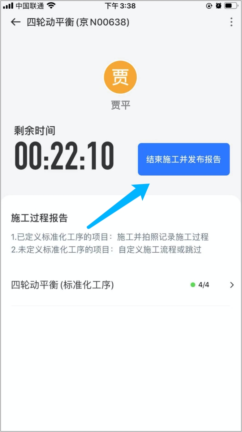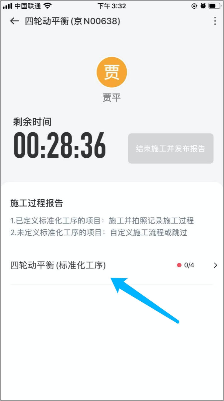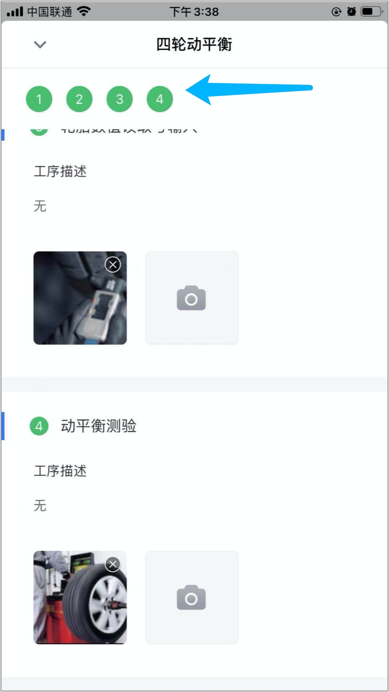 技师在页面中点击“四轮动平衡(标准化工序)”,弹出施工工序弹窗。