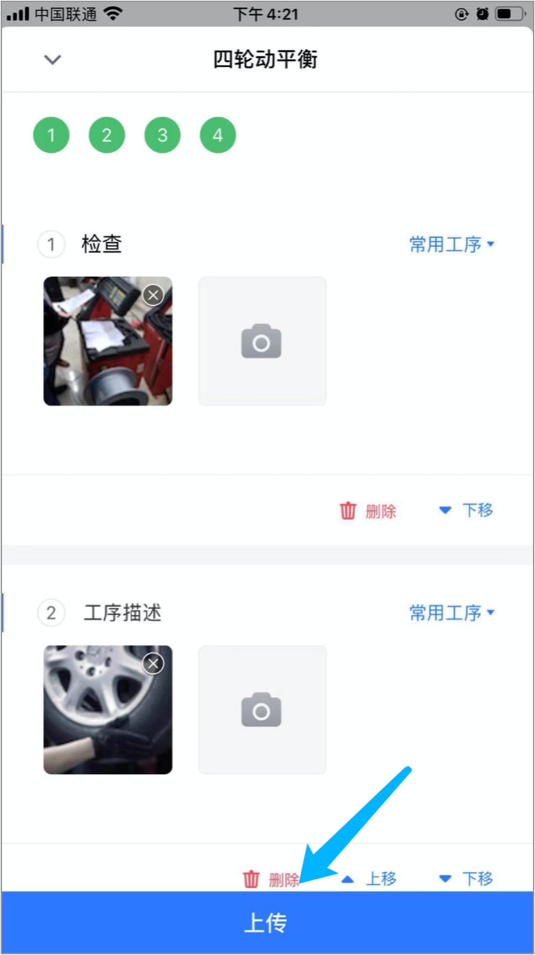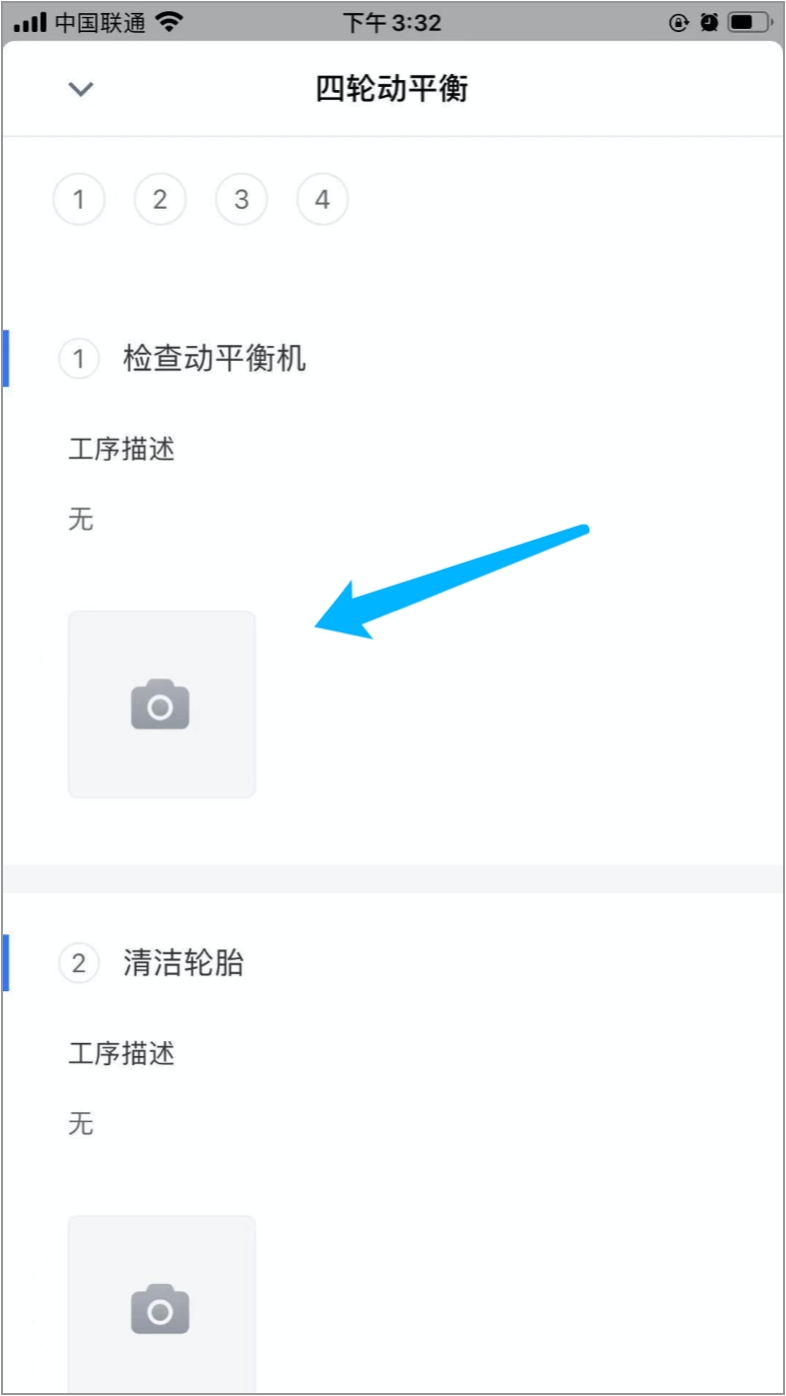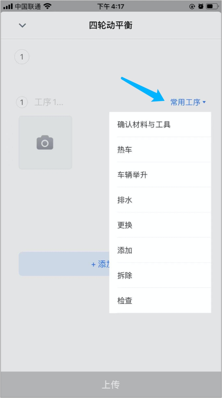 技师在弹窗中按照工序进行施工,点击相机图标拍照记录。