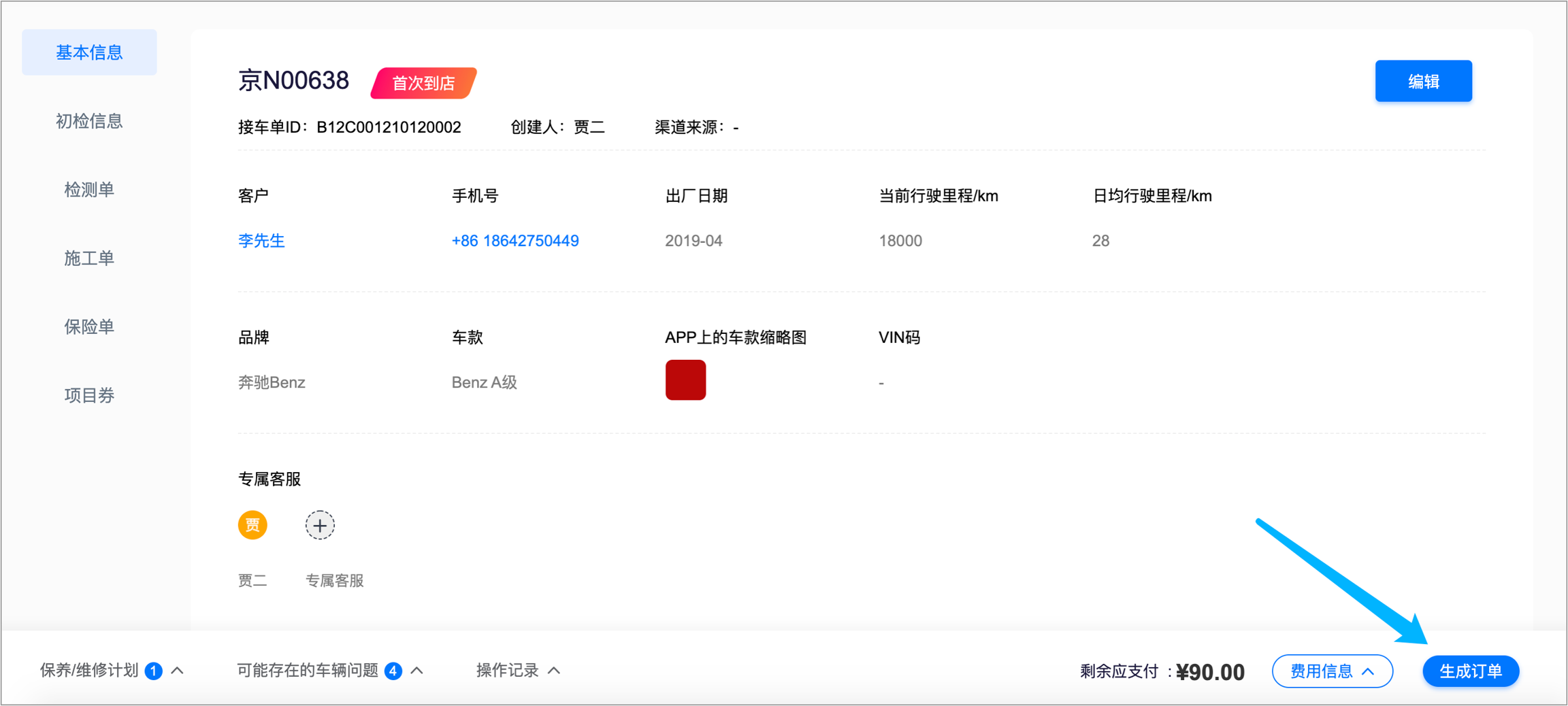接车单在完成订单支付后,信息无法再做修改。
