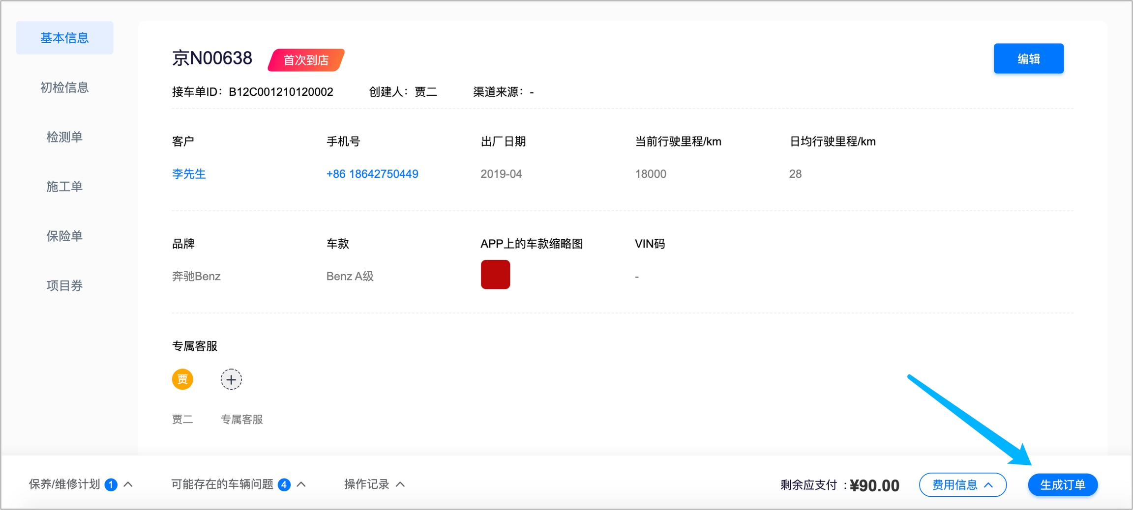 奔驰A车主在付款时,门店技师用Shop OS(门店管理系统)完成该订单的支付操作。