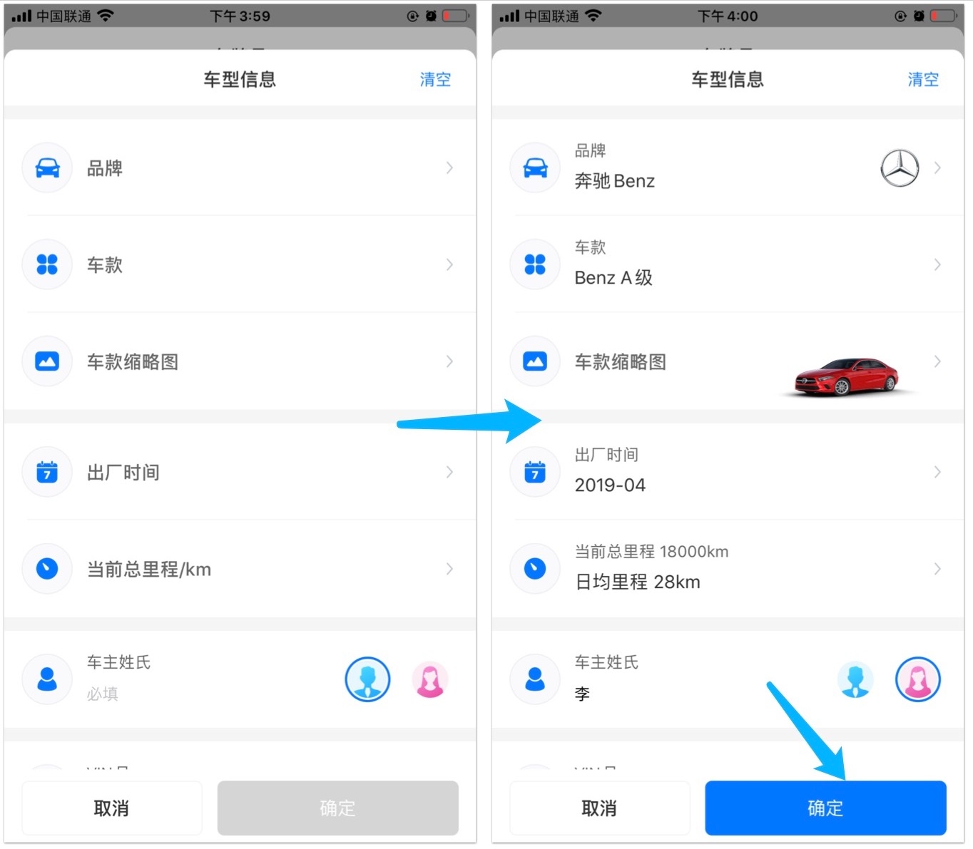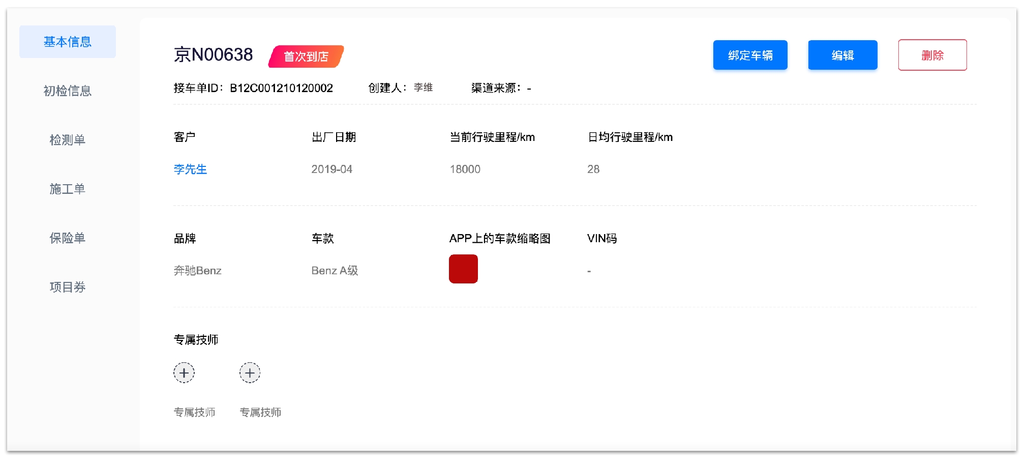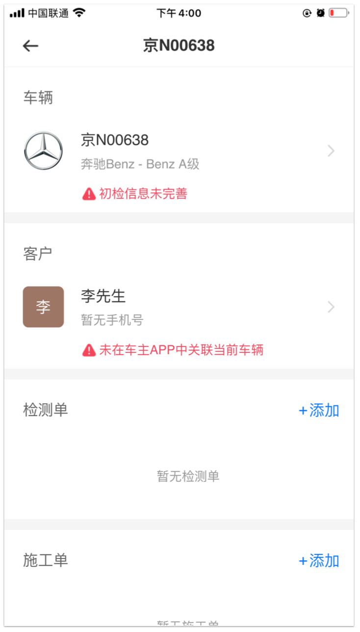 奔驰A第一次到店,门店技师使用Intelligent Technician(技师端)接待。