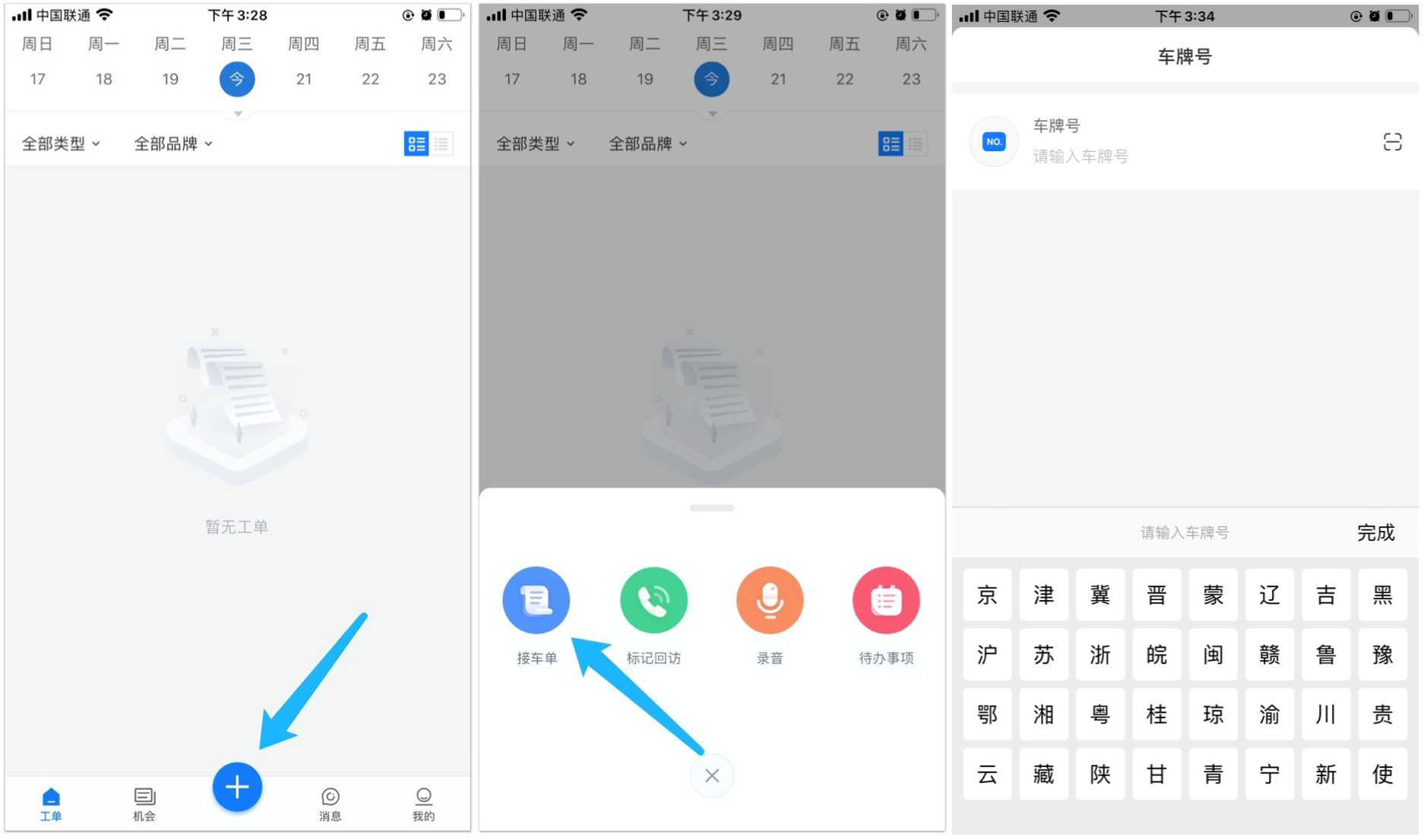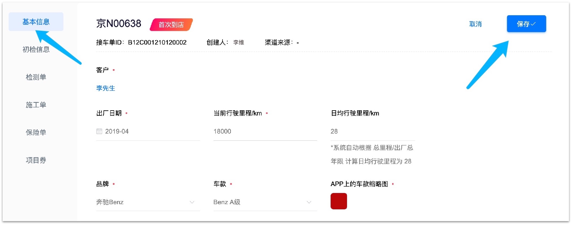 车辆首次创建接车单需要输入完整车型信息。从车辆第二次到店开始,只需输入车牌号,车型信息会自动显示,不用再重复填写。