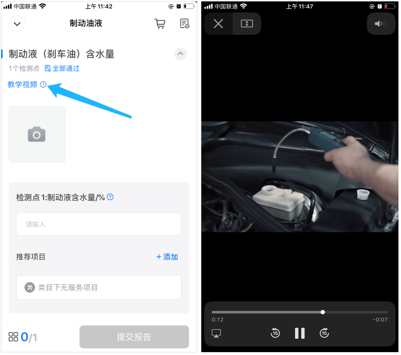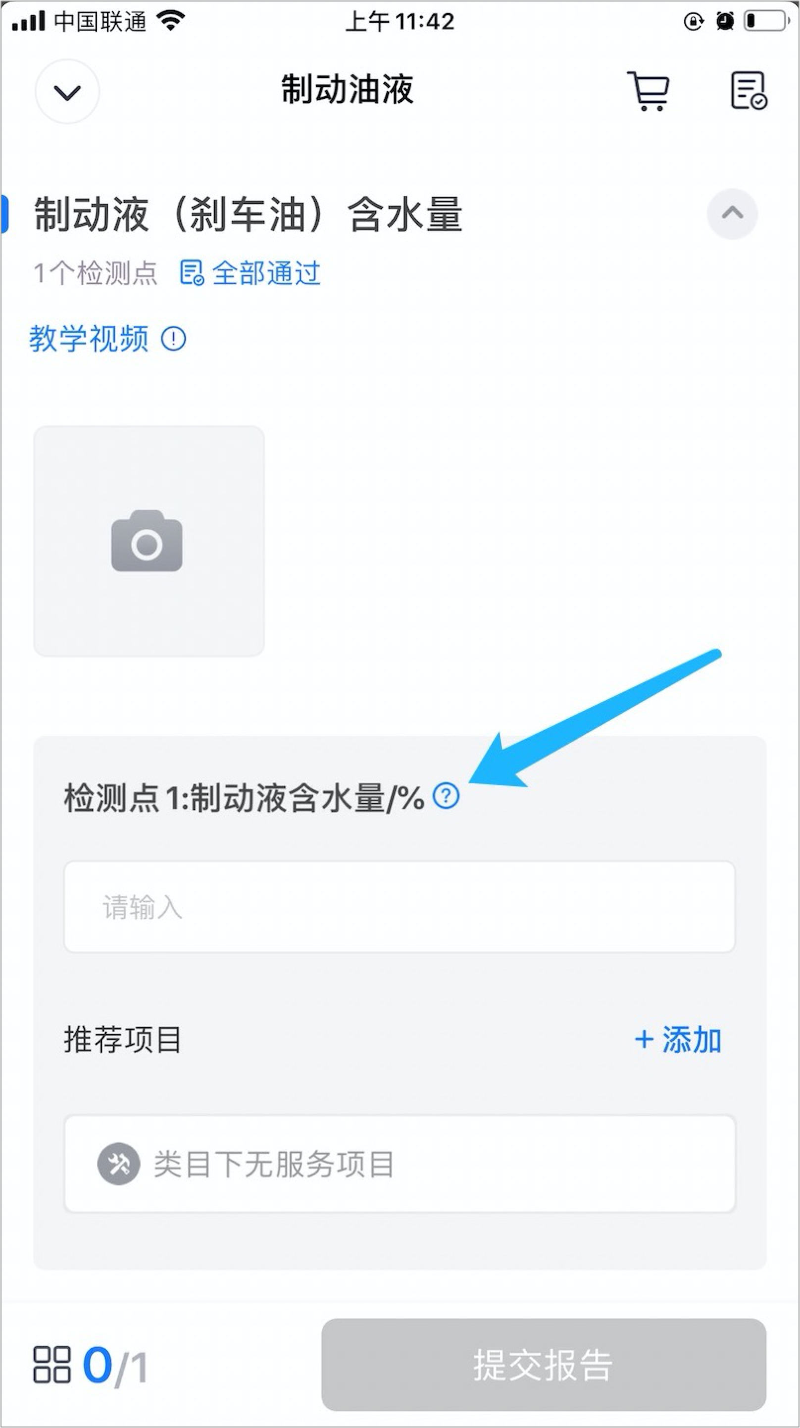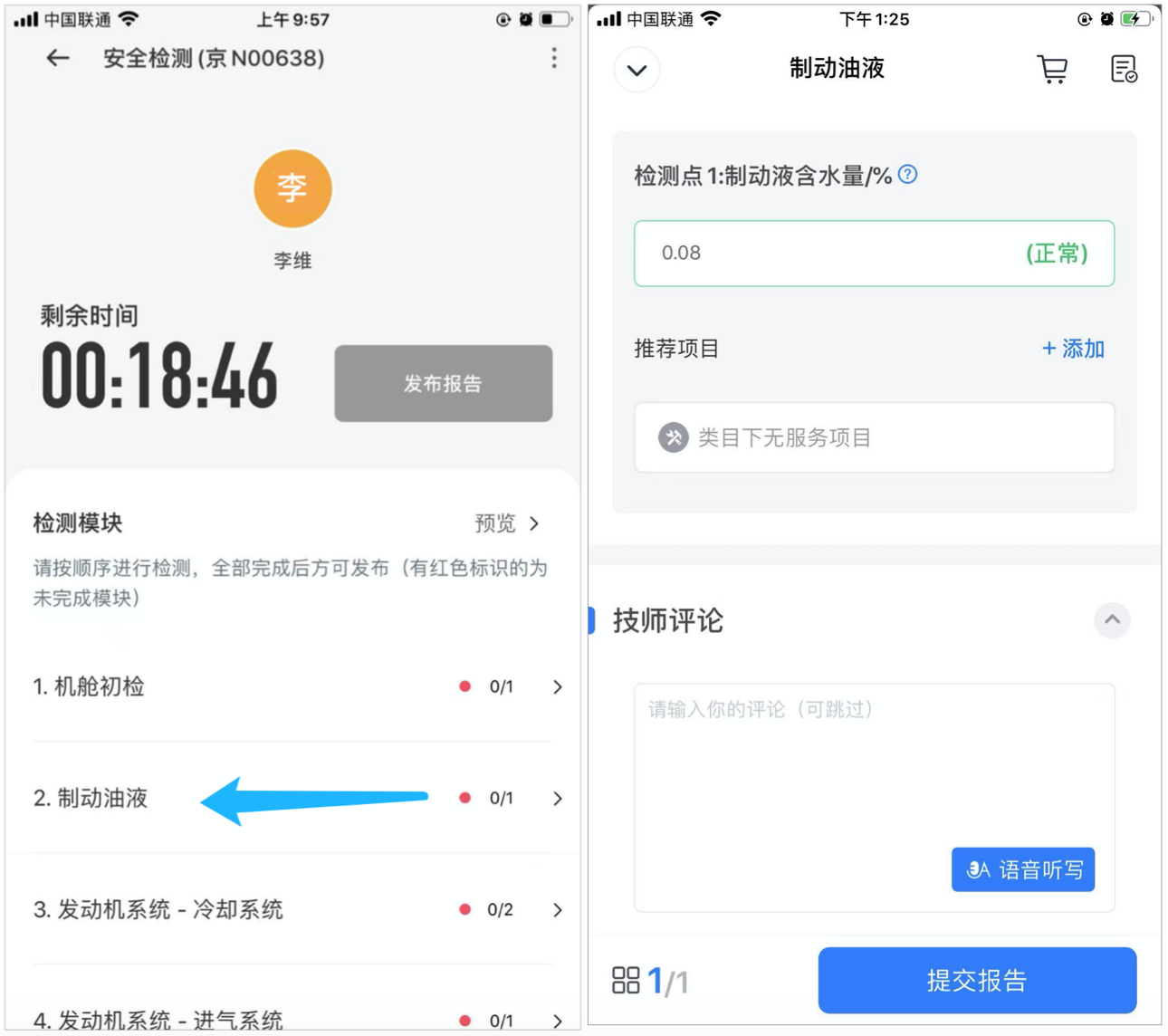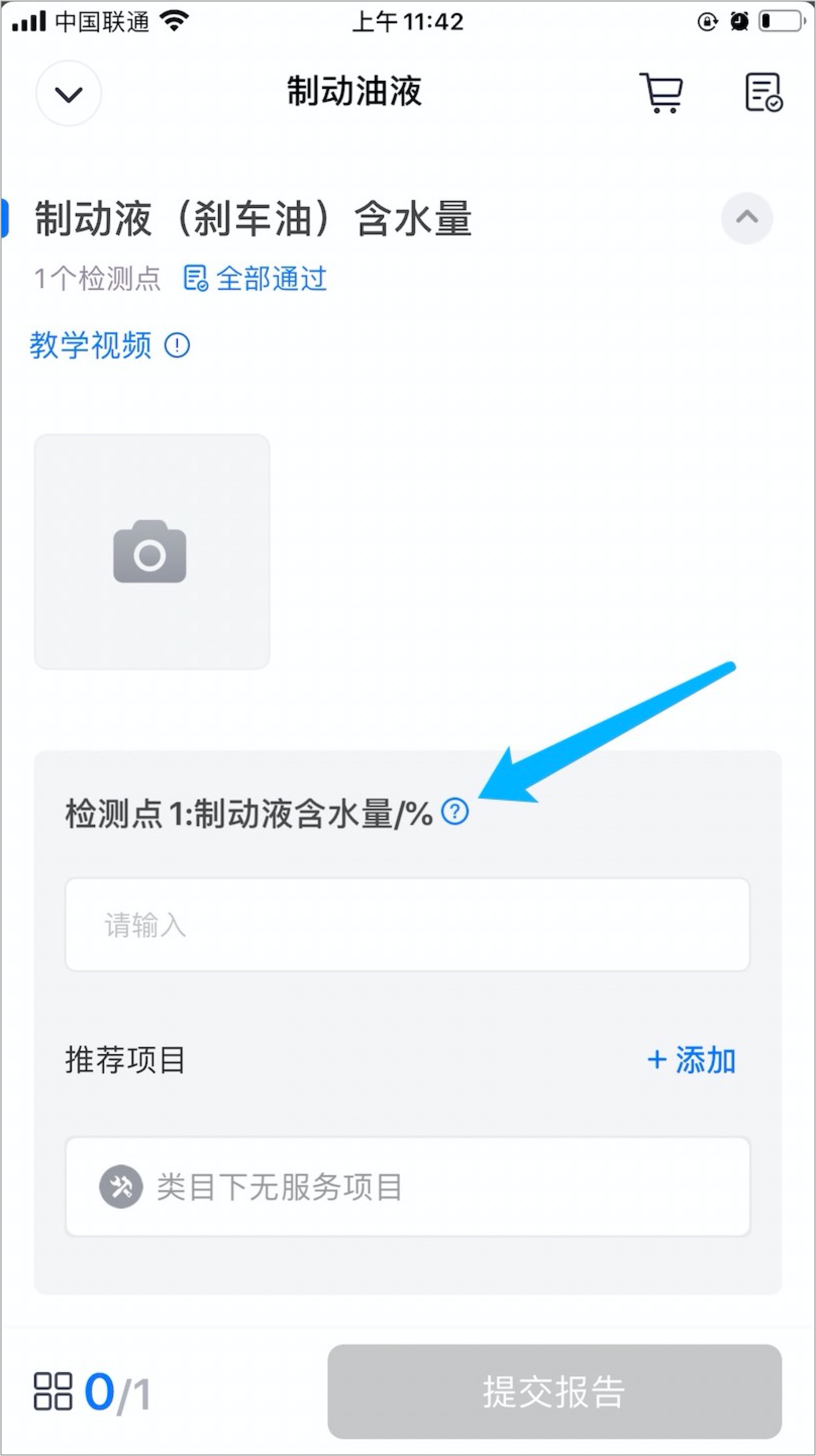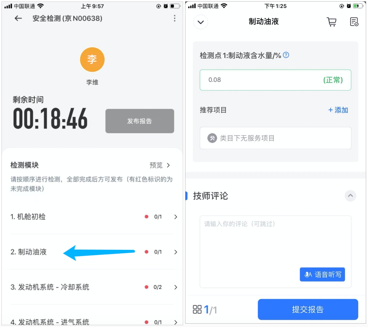 技师在检测模块页面,点击“制动油液”,按照指示拍照,并按照题目检测、填写检测结果,完成后点击“提交报告”。
