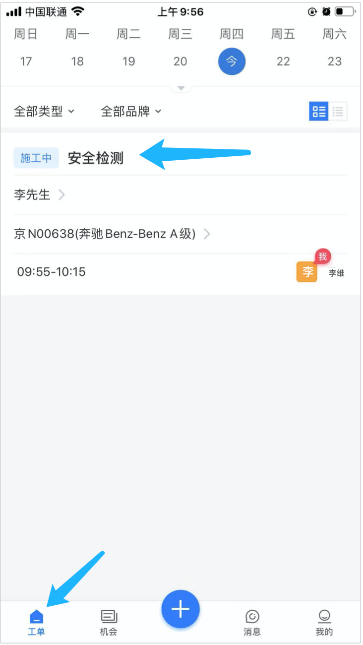 技师名下未完成的检测单,都会显示在“工单“页面。
