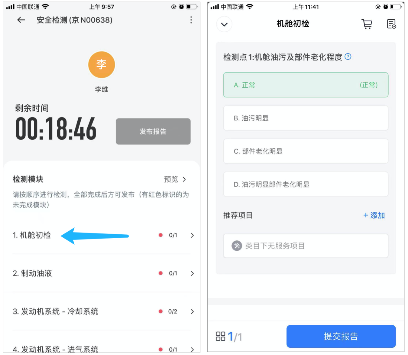 技师在检测模块页面,按提示顺序进行检测。点击“机舱初检”,按照指示拍照,并按照题目检测、填写检测结果,完成后点击“提交报告”。