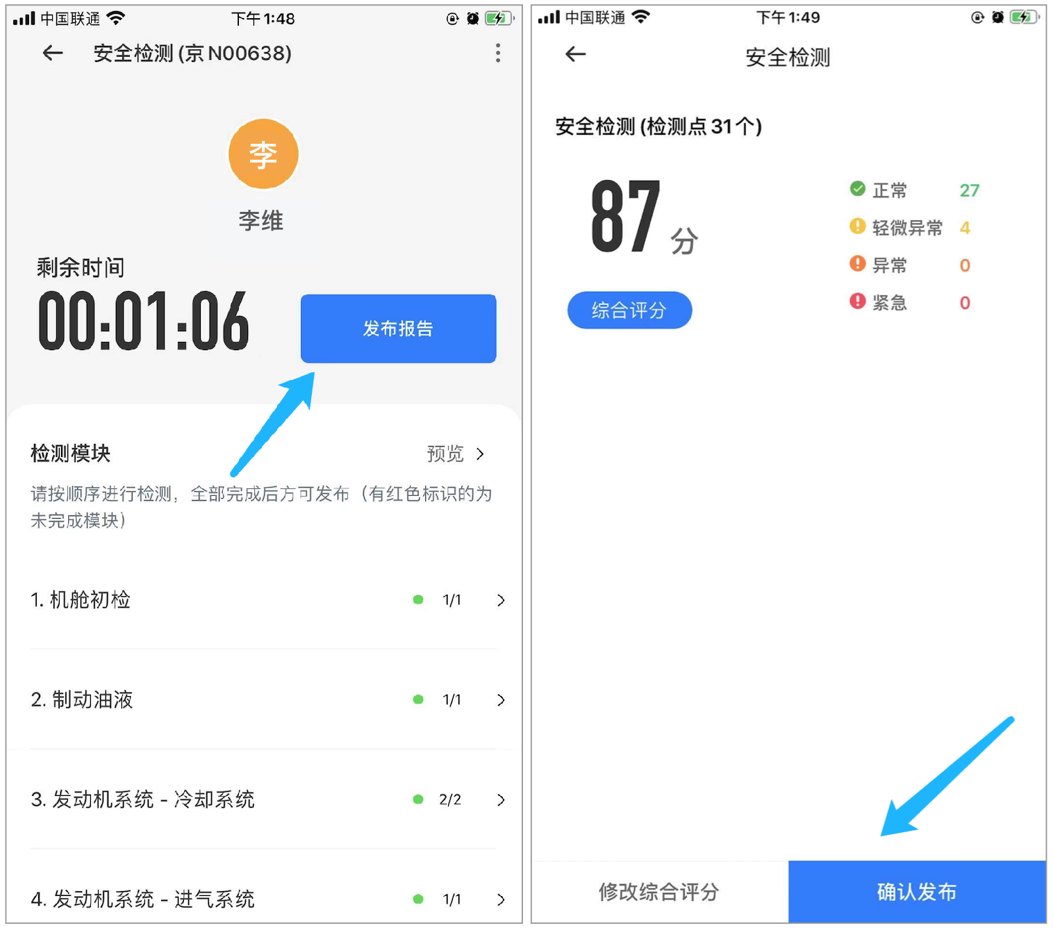 技师完成全部模块检测后,点击“发布报告”,确认评分后点击“确认发布”。