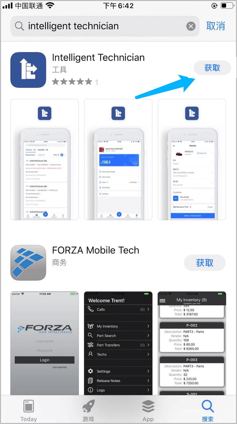技师在搜索栏输入“Intelligent Technician”,点击“获取”,开始下载。