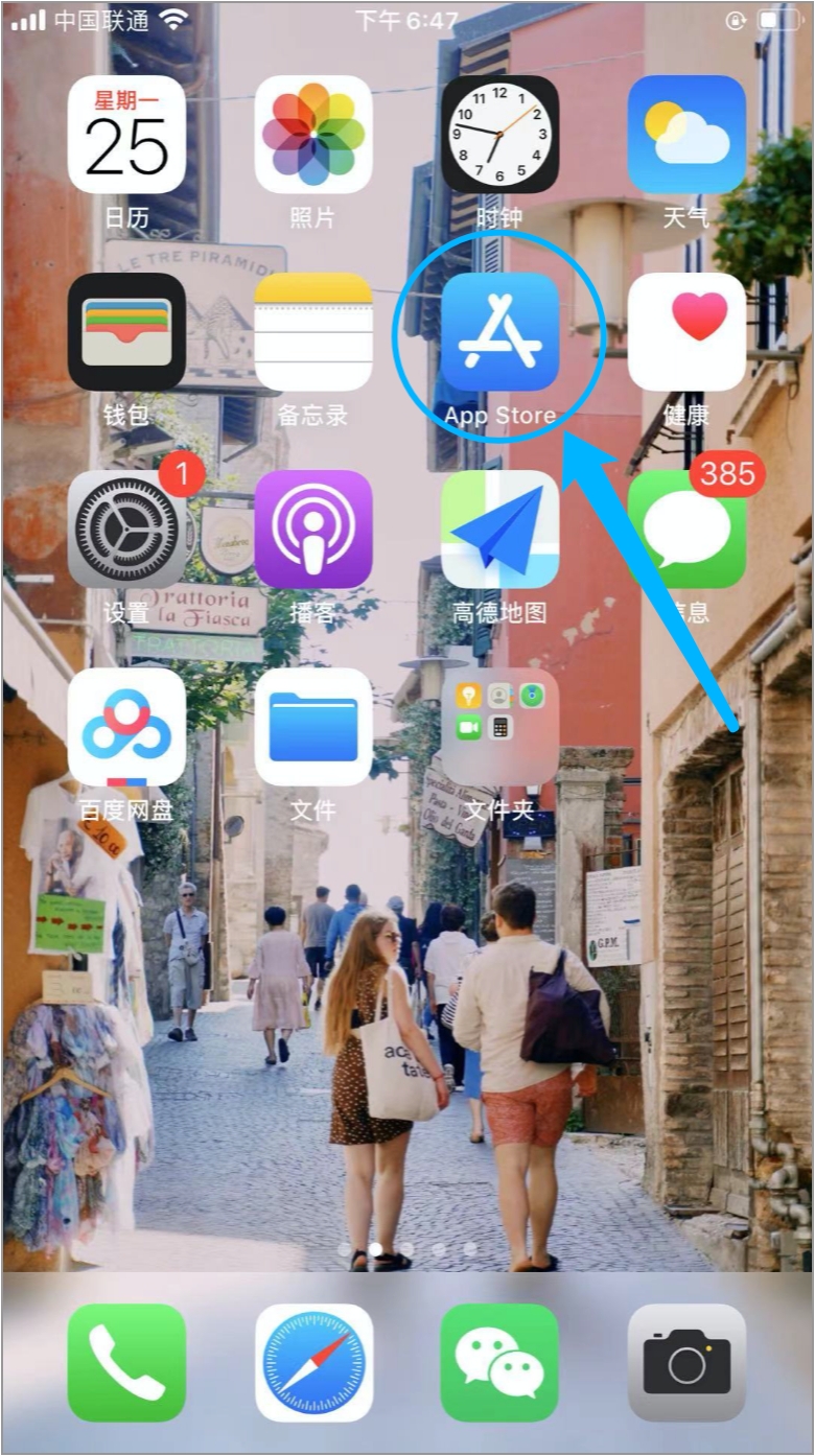 技师在手机主屏幕,点击苹果商店(App Store)。